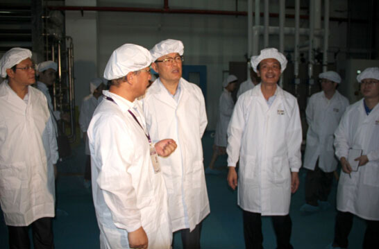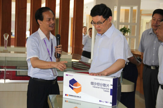 何總向蔣定之省長介紹公司主要產品——纈沙坦分散片